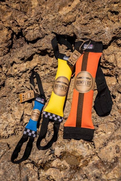 The Mini-Double Tug is simply the smaller version of The Double Tug and was made for smaller dogs to be able to bite down and hold onto a bumper that fits their mouth. In the same way, its design was first conceived and patented by Katie's Bumpers in 2002 as a breakthrough innovation for trainers and regular folks alike to be able to train and interact with their dogs.