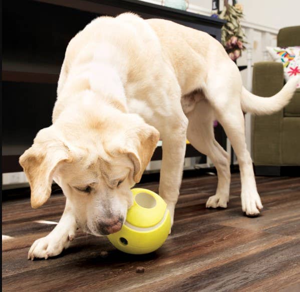 KONG Rewards Tennis adds a topspin to treat-dispensing that rewards with kibble, treats and fun with every action-packed roll. Built from durable materials and featuring unpredictable movement this toy is sure to keep dogs engaged while providing mental and physical enrichment. An easy-fill funnel makes repeated use simple. Can also be used as a food bowl replacement to help manage weight.