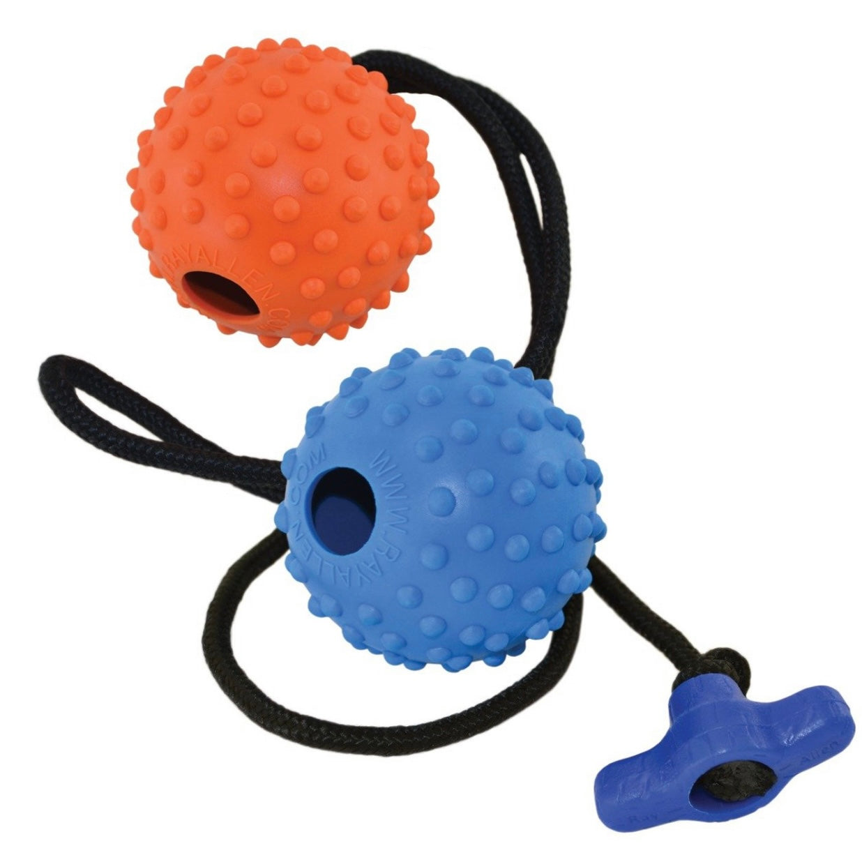 This newly redesigned Ball on a Rope from Ray Allen is the perfect reward toy for your K9. This dog ball toy features a hollow core combined with a soft rubber surface with knobs that allows for a better grip. The toy comes with a medium 2.5-inch diameter ball with your choice of a T-handle or loop handle. Shop Ray Allen for all of your dog's favorite toys!