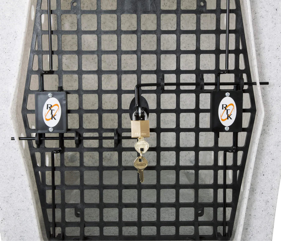 These two rods with hardware attach horizontally onto the outside of your kennel door adding another level of security for your companion. (Padlock not included.) Replacement rods for the latch system on Ruff Land™ Kennels Available for Mid-Size, Medium, Intermediate, Large or X-Large Ruff Land™ Kennels